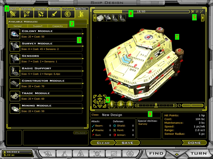 - Ship statistics. Since you'll create quite a lot of different designs in each game, you should name it properly, to avoid confusion when you'll put it in the building queue on your planets. It is good idea to include some of design's stats in the name, like Raptor lrg b20 a60p20 5 (large hull, 20 beam attack, 60 armors and 20 point defenses, speed 5).