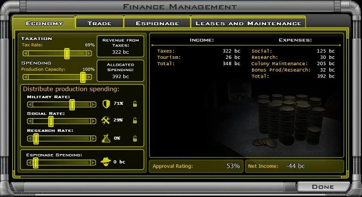 - Spending - The amount of credits you're currently spending on planetary production (military, social, and research). Note bonus production spending is not shown.