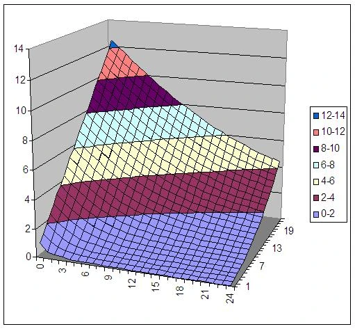 Thanks to quick programming and Excel, here is a graph of average damage with various attack/defense. X axis is defense (from 0-24), the Y axis is weapon strength (1-24), and the Z axis is average damage. I ran this for numbers from 0-100 and 1-100, but the results were difficult to read and the graph has the same shape. Running it for different configurations such as using diverse weapons (eg: 4/4/4 vs 12/0/0) showed that spreading weapon power quickly reduced the average damage as defenses grew larger. Mixing defenses varies when faced against mixed attack ships, improving quite as both offense and defense numbers grew larger. However, this assumed a perfectly even distribution of both weapons and defense. Should the attacker focus on one weapon type, the defender does better by focusing on that defense.