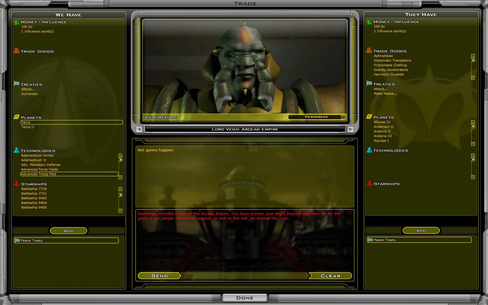 Using this window, you may negotiate treaties and trade resources or technologies. Tradable goods include money, influence points, Trade Goods, technology, planets, starbases, ships, or treaties. Treaties include peace treaties, alliances, or offering to declare war or make peace with another civilization.